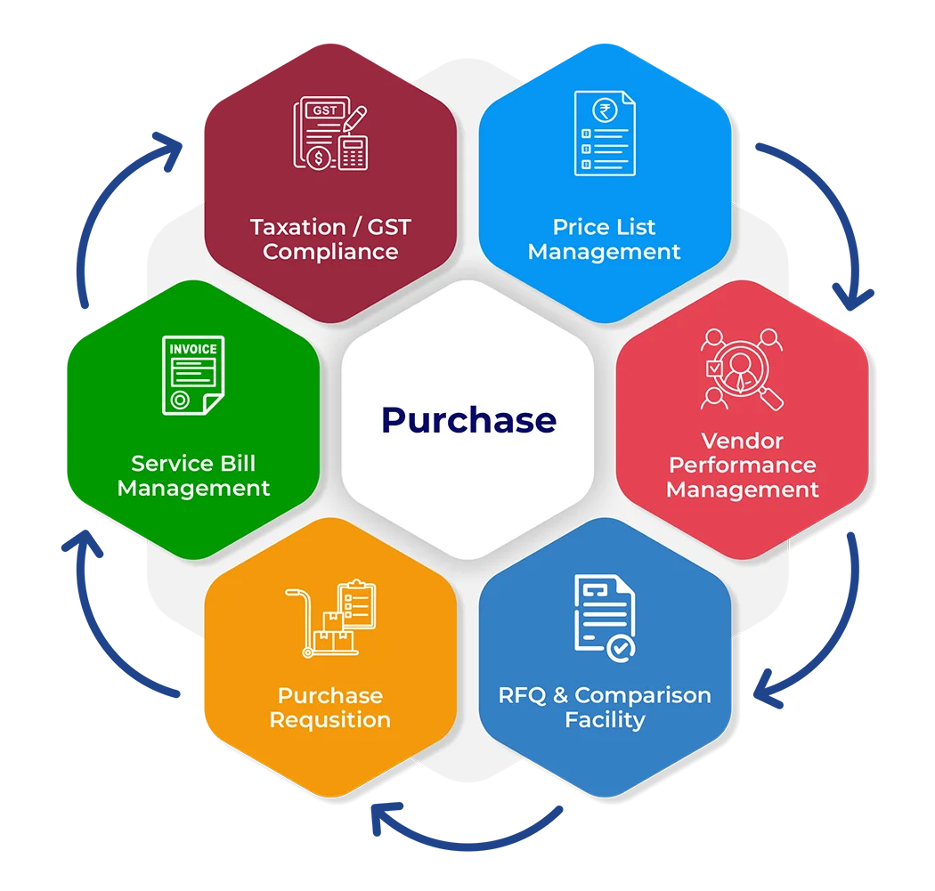Purchase modules take care of all the processes that are part of procurement of items or raw materials that are required for organization. Purchase module consist of functionalities like supplier/vendor listing, supplier & item linking, sending quotation request to vendors, receiving & recording quotations, analysis of quotations, preparing purchase orders, tracking the purchase items, preparing GRNs& updating stocks & various reports . Purchase module is integrated with Inventory module & Engineering/production module for updating of stocks.